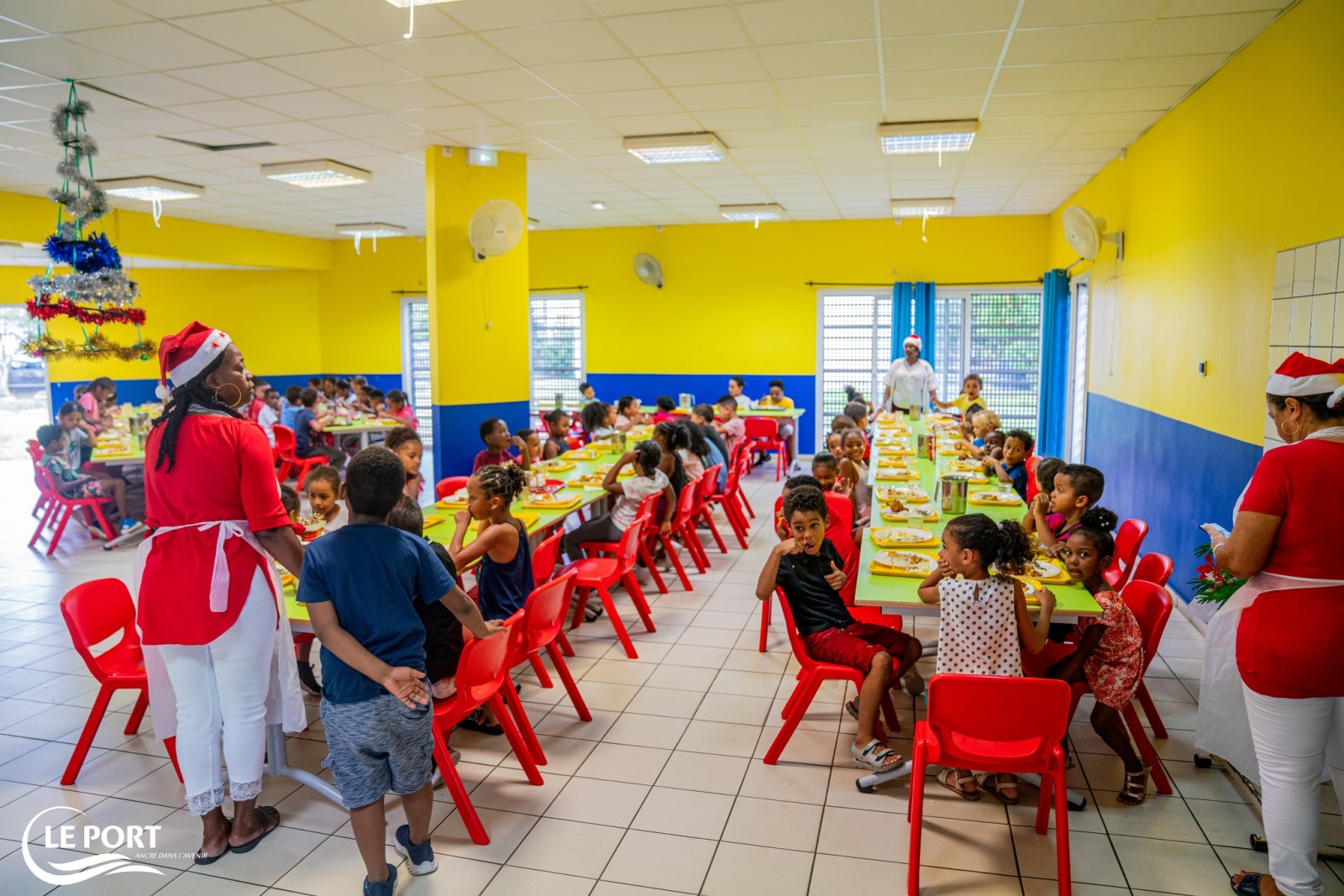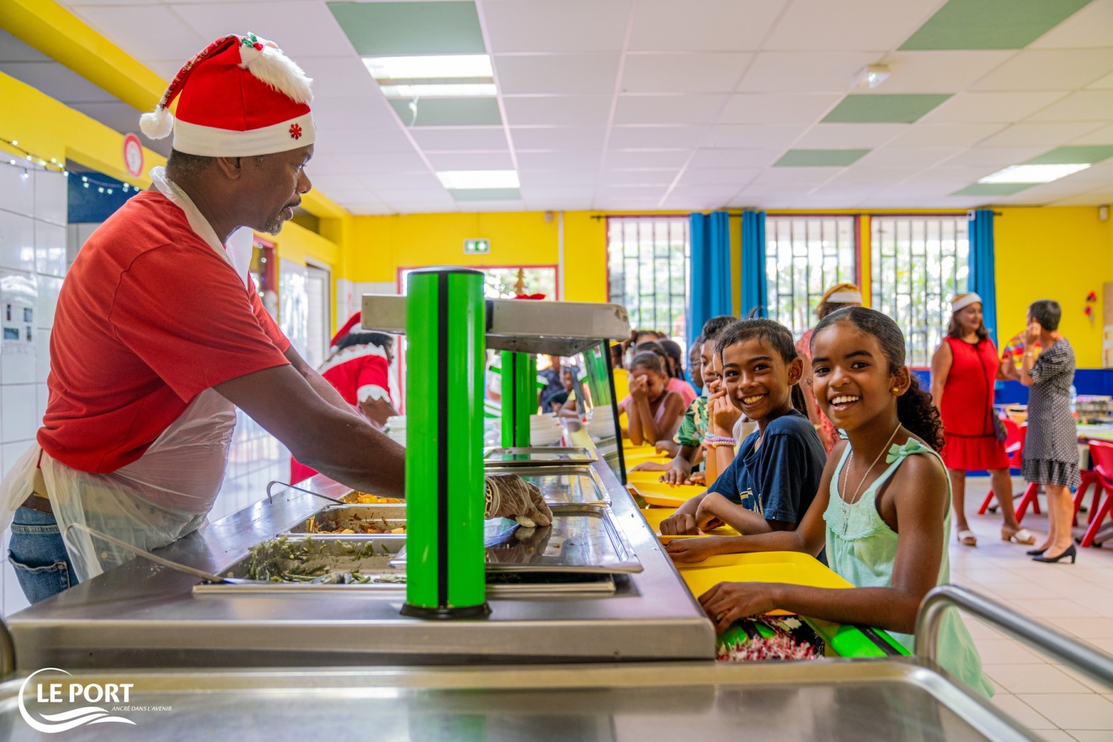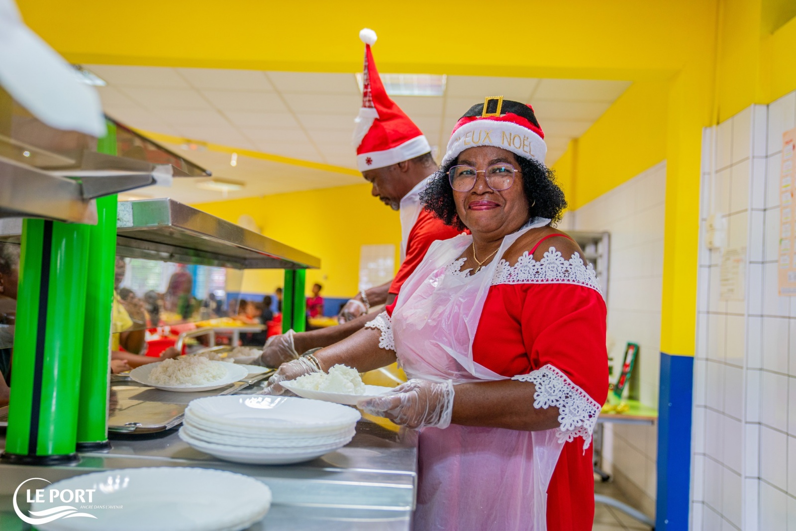 Ce jeudi 7 décembre 2023, Noël s'est invité dans les assiettes des écoliers portois. Les chefs du service restauration scolaire de la ville du Port ont imaginé un menu traditionnel des repas de fêtes de La Réunion. Au menu, cari de poulet frais au palmiste, riz bio, sauté de haricots verts, fruits et chocolat pour le dessert. Dans l'école Camille Macarty l'adjointe au maire, Annick Le Toulec s'est joint à la partie. (Photos de la Mairie du Port).