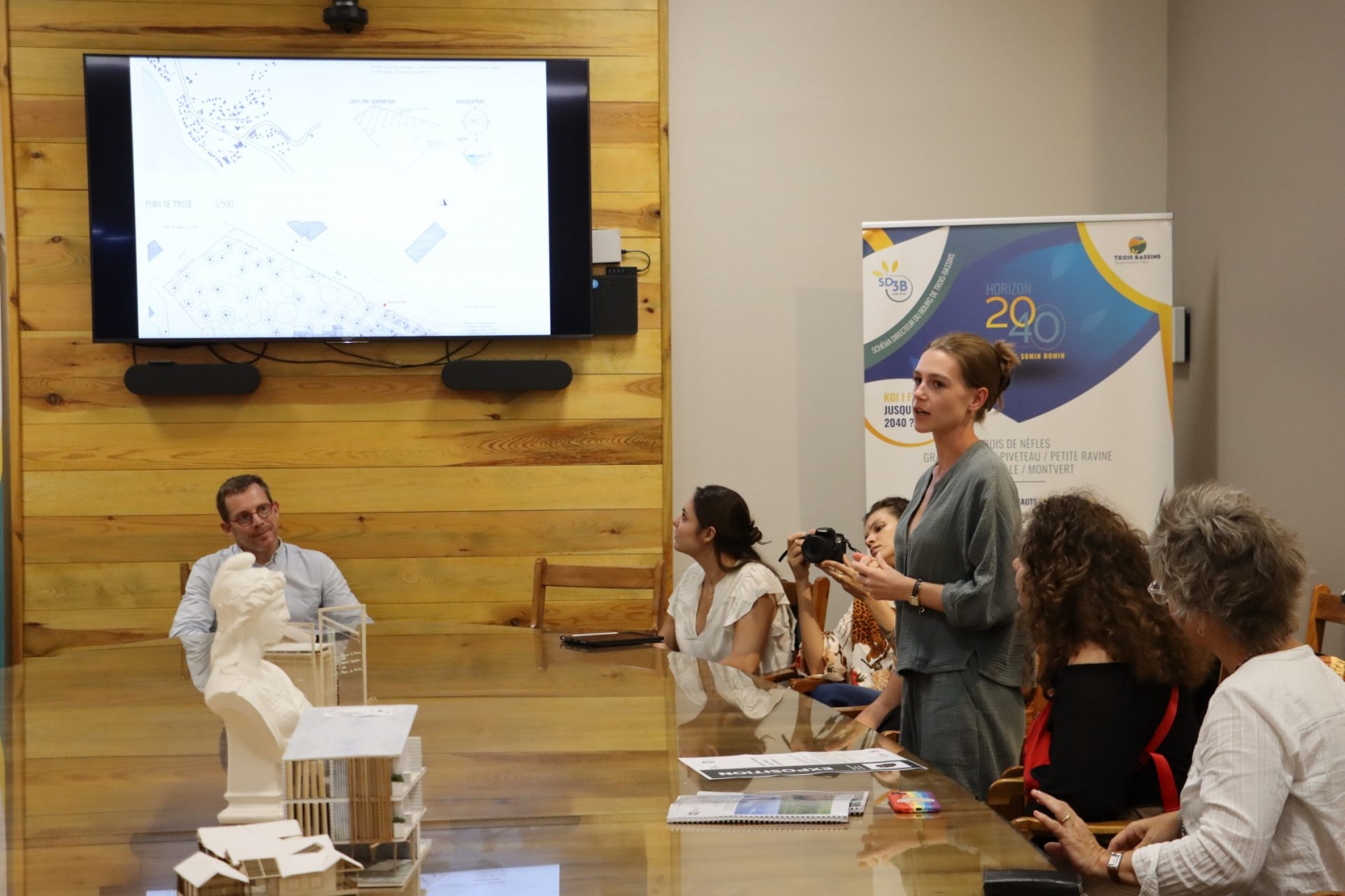Aux côtés des étudiants lors de la présentation de ces projet, Daniel Pausé, maire de Trois-Bassins et vice-président du Territoire de l’Ouest ainsi que Michel Clémente, élu au Territoire de l’Ouest et membre du Conseil d’administration de l’ENSA La Réunion.