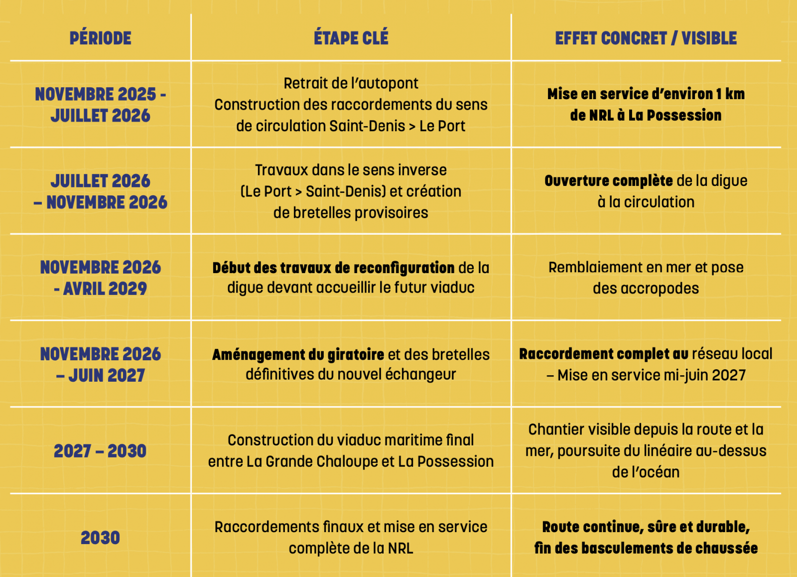 À un peu plus de dix ans du lancement des premiers travaux, qui a permis la mise en service, depuis 2023, des 5,4 premiers kilomètres de viaduc entre Saint-Denis et La Grande Chaloupe, la Région Réunion engage la construction du deuxième et dernier viaduc maritime. Long de 2,5 kilomètres, il viendra raccorder définitivement Saint-Denis à La Possession. Un axe fréquenté, quotidiennement, par quelques 70.000 usagers.