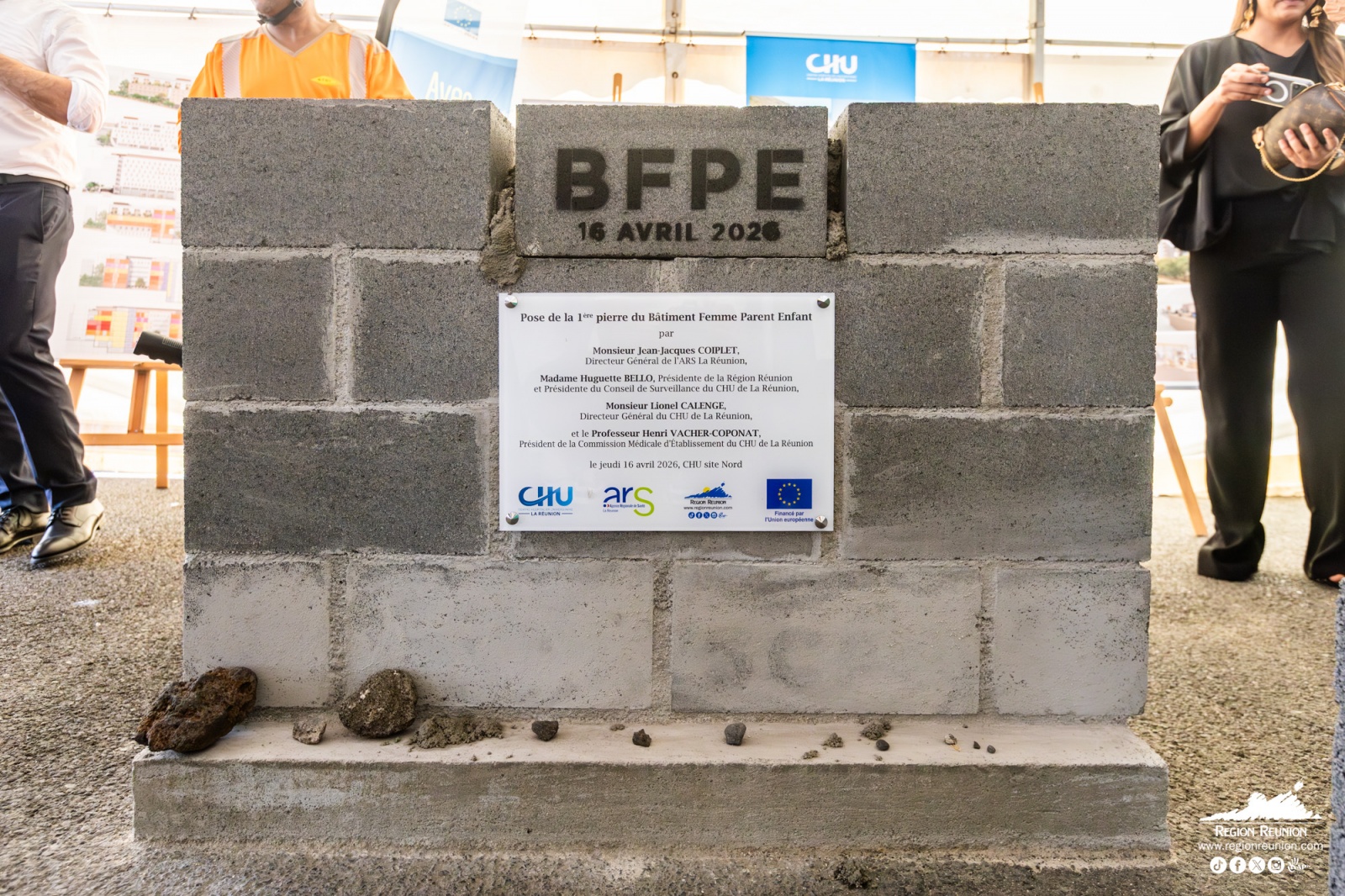 La Présidente de Région, Huguette Bello, était présente au CHU Nord ce jeudi 16 avril 2026 pour la pose de la première pierre du Bâtiment Femme Parent Enfant (BFPE). Ce nouveau bâtiment, réparti sur 9 niveaux, remplacera l’actuel Pôle Femme Mère Enfant arrivé à ses limites tant dans son organisation que dans ses infrastructures. En réunissant en un même lieu l’ensemble des activités médicales, chirurgicales et de soins. Objectifs : mieux soigner les femmes, les enfants et mieux accompagner leur famille. Nous publions, ci-dessous, la publication de la Région Réunion à ce sujet. (Photo : Région Réunion)