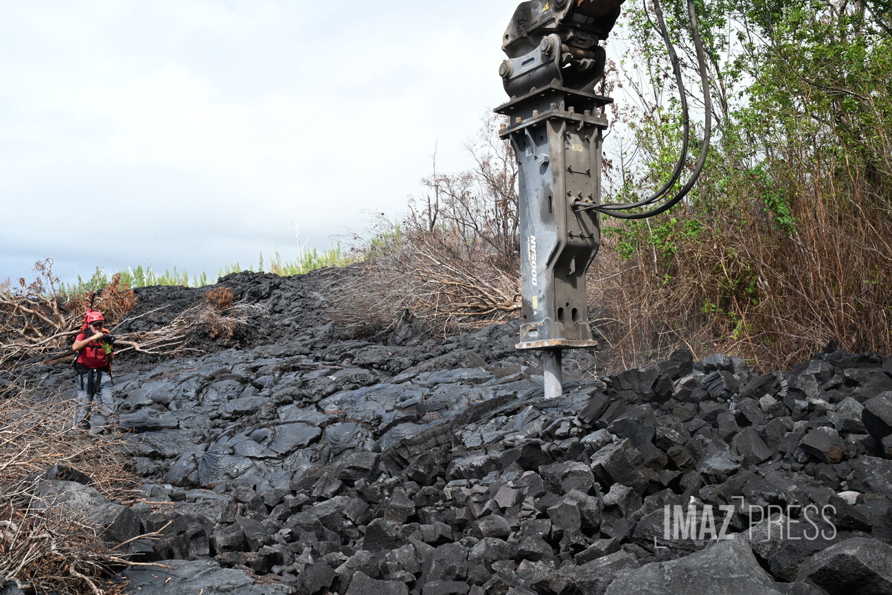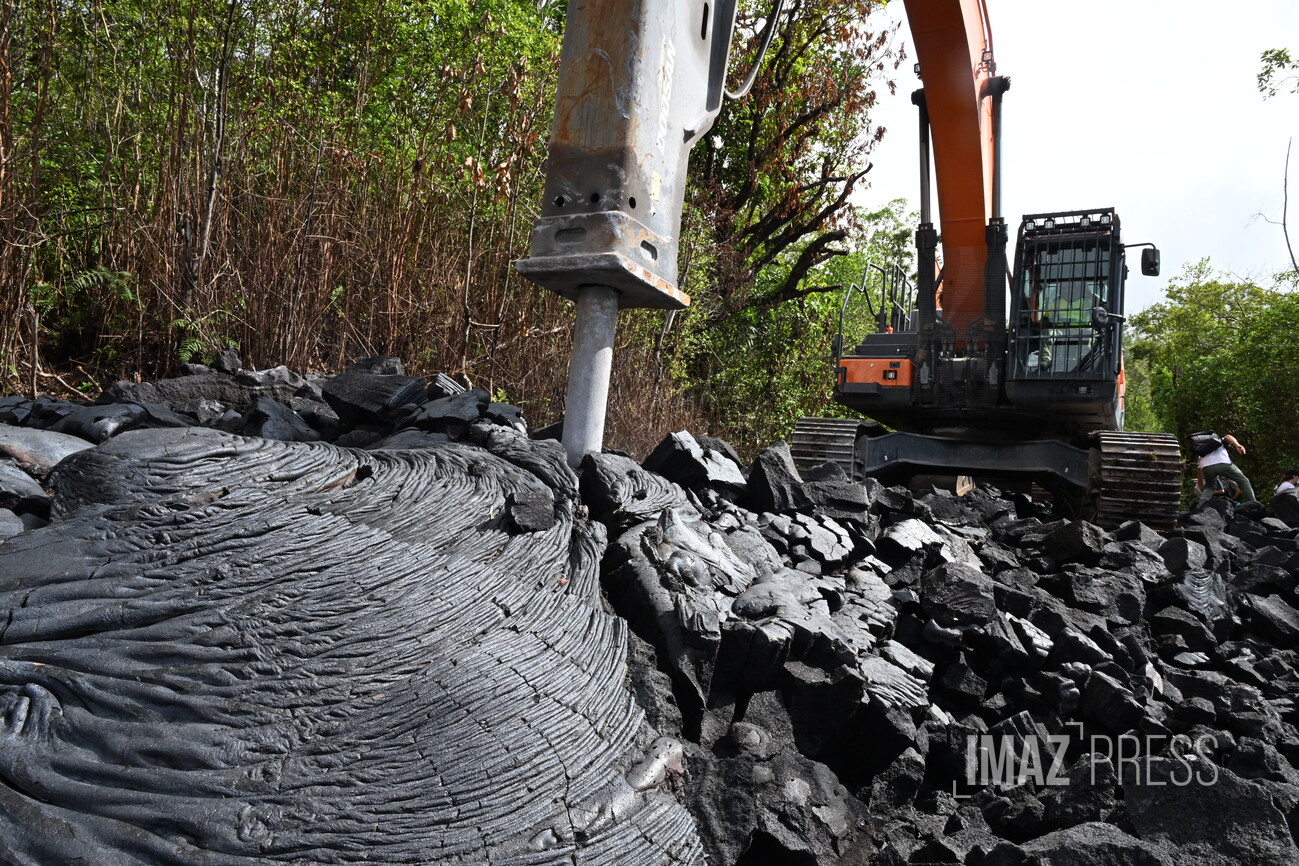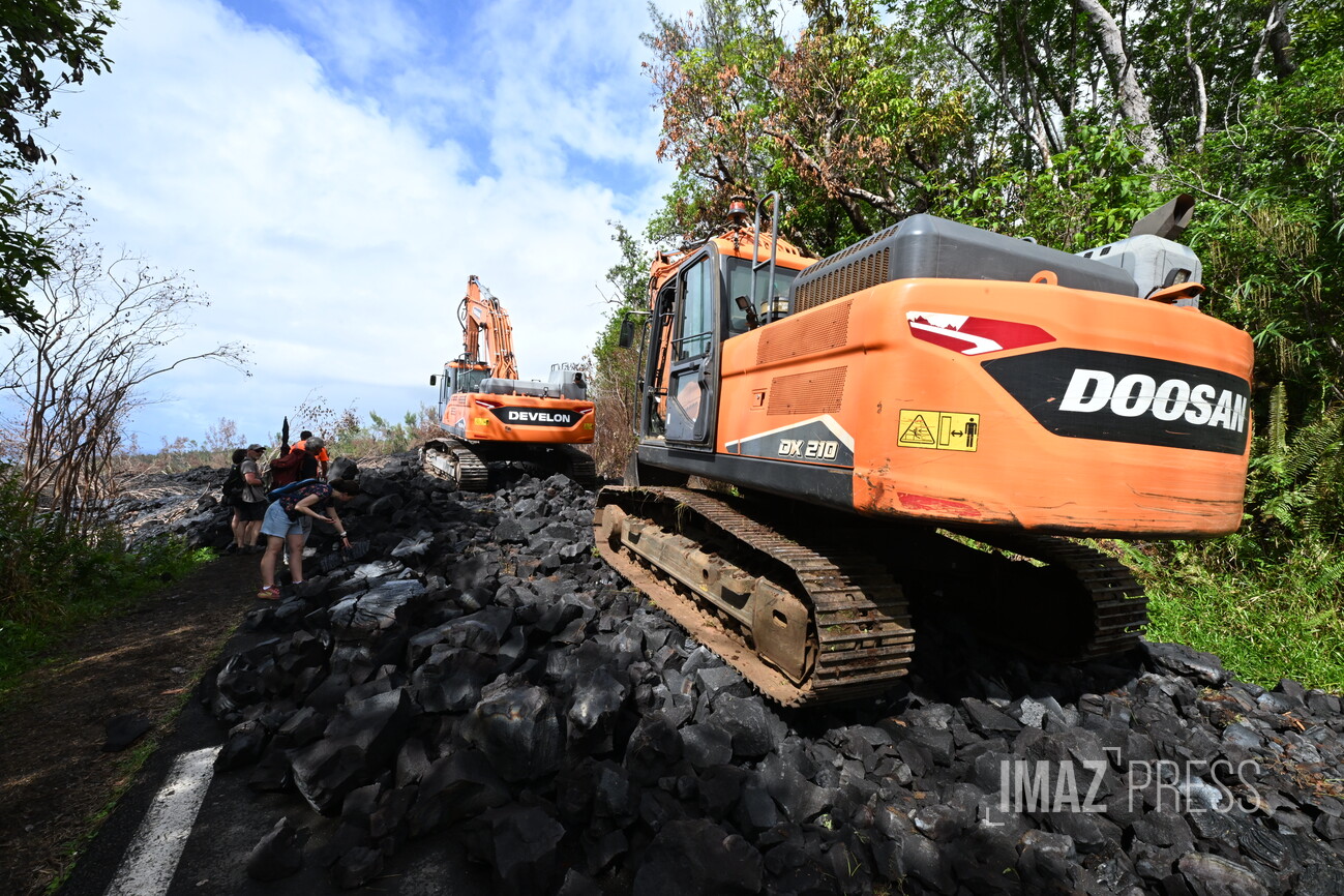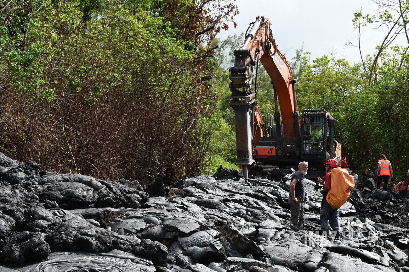 La Région Réunion démarre les travaux de reconstruction de la RN2 au niveau des coulées de lave afin d'y permettre à nouveau la circulation grâce à la création d'une piste provisoire de 800 mètres. Le brise-roche entre donc en piste ce lundi 27 avril 2026, l'engin s'attaque à la lave refroidie pour dégager la route. Sauf reprise de l'éruption, les travaux sur la portion de route située entre Sainte-Rose et Saint-Philippe se dérouleront en deux étapes, avec tout d'abord le terrassement du chantier, phase durant laquelle le stationnement le long de la RN2 restera interdit.