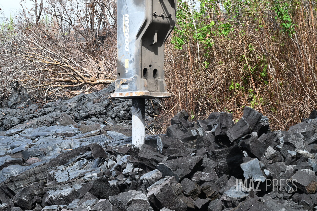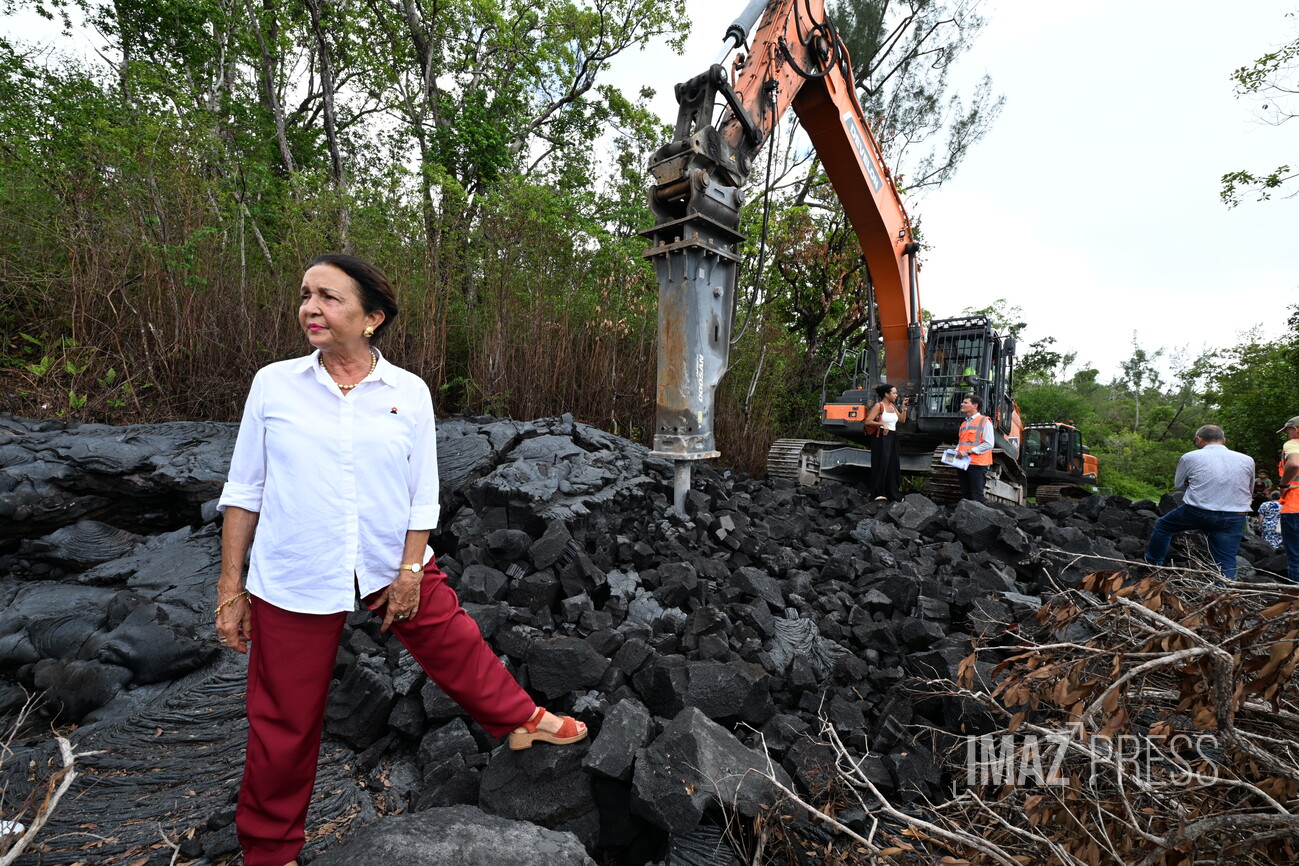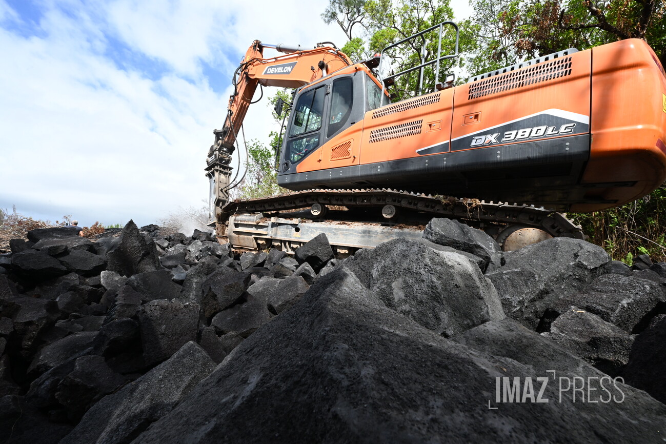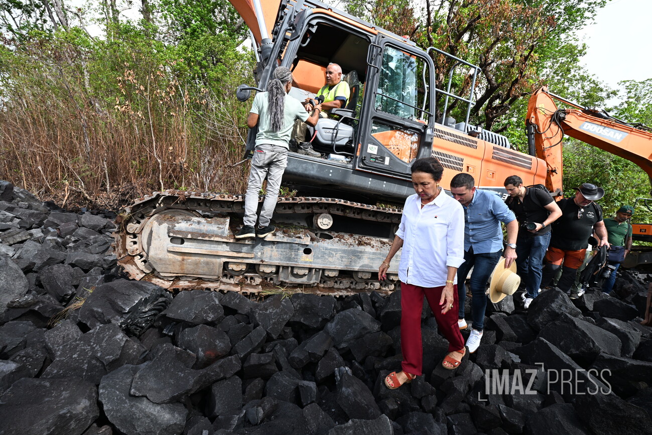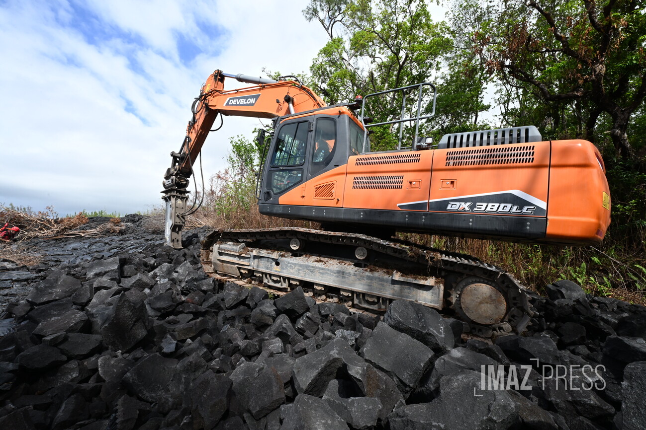 La Région Réunion démarre les travaux de reconstruction de la RN2 au niveau des coulées de lave afin d'y permettre à nouveau la circulation grâce à la création d'une piste provisoire de 800 mètres. Le brise-roche entre donc en piste ce lundi 27 avril 2026, l'engin s'attaque à la lave refroidie pour dégager la route. Sauf reprise de l'éruption, les travaux sur la portion de route située entre Sainte-Rose et Saint-Philippe se dérouleront en deux étapes, avec tout d'abord le terrassement du chantier, phase durant laquelle le stationnement le long de la RN2 restera interdit.