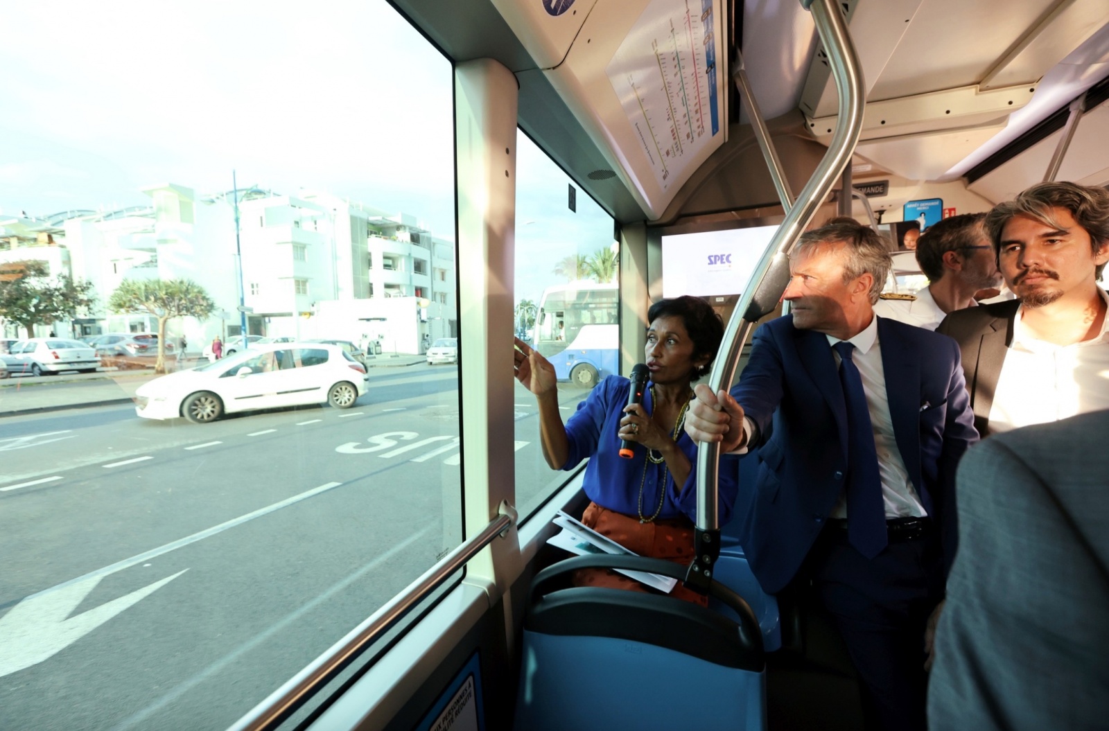 Pour la deuxième partie de la séquence, la délégation a pris le bus en direction du Chaudron. La Maire Éricka Bareigts s’est lancée dans une visite guidée explicative de sa Ville en évoquant les problématiques liées au transport et la volonté de transformer Saint-Denis en ville du quart d’heure notamment avec l’arrivée du projet BAOBAB mené par la CINOR. Ce projet de bus à haut niveau de service entre l’Ouest et l’aéroport en passant par Saint-Denis est un projet qui serait complémentaire à l’offre proposée par le téléphérique, le bus gratuit pour les 6 à 23 ans, etc. La délégation ministérielle a ensuite fait un arrêt au Pôle d’Échange Multimodal du Chaudron, l’occasion pour le Ministre d’être mis au fait des facilités de mobilité engendrées par la première année de fonctionnement du téléphérique.