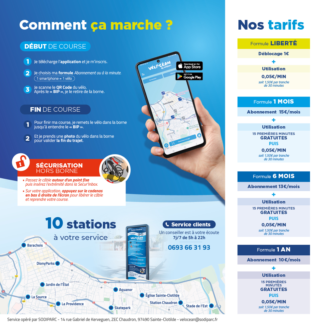 Après avoir téléchargé l'application "Vélocéan by Sodiparc" et s'être inscrit, choisissez la formule abonnement ou à la minute. Arrivé.e à une des 10 stations (Barachois, Dionyparks, Jardin de l'État, La Source, La Providence, Aquanor, Skatepark, Église Saint-Clotilde, Station Chaudron, Stade de l'Est), scannez le QR Code du vélo. Après le "BIP", retirez le vélo de la borne.
