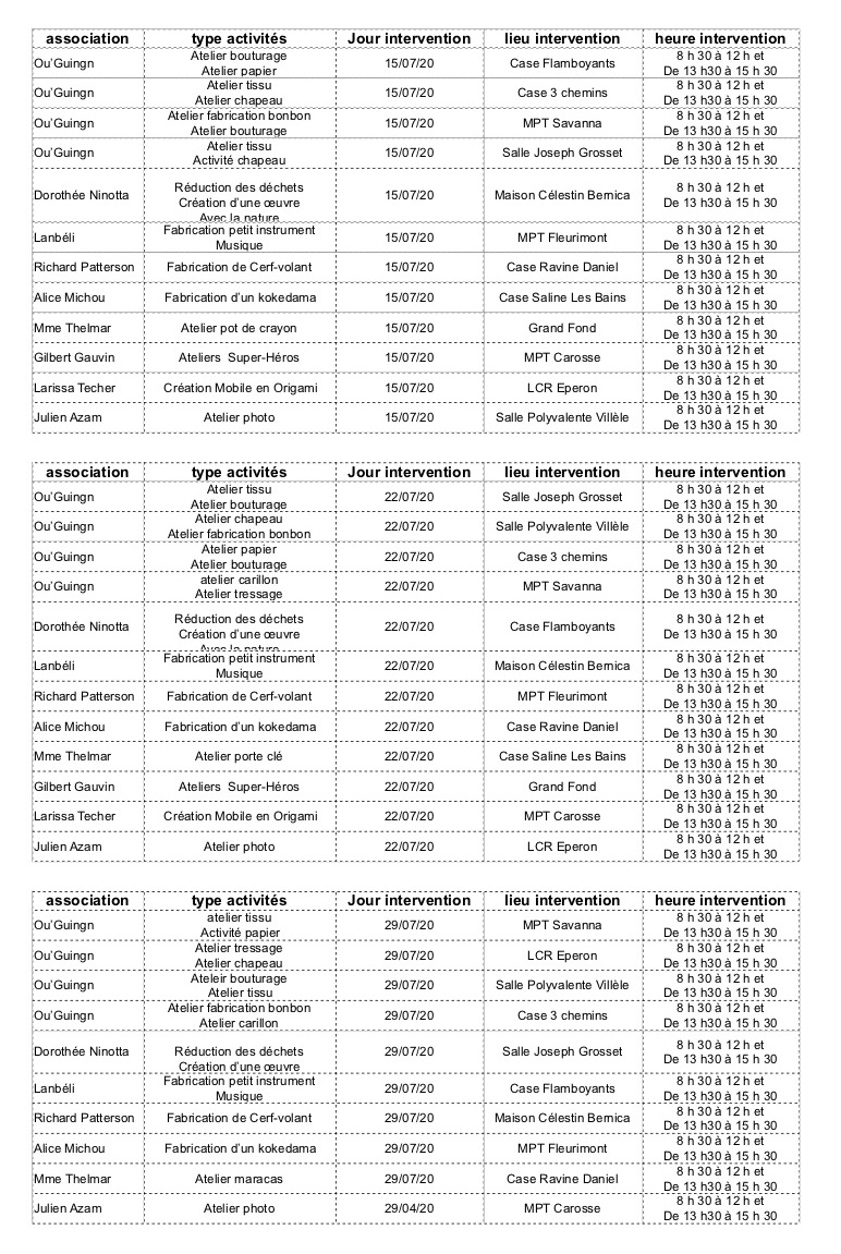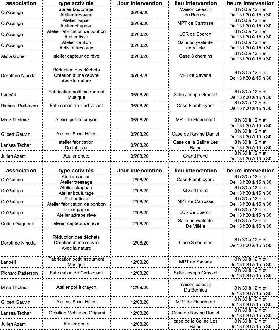 Les mêmes activités sont proposées également au mois d’août avec des intervenants pros de recup’ (association Ou Guingn), de la réduction des déchets (Dorothée Ninotta), de la photographie (Julien Azam) ou encore de la fabrication de tableau (Larissa Técher) pour ce citer qu’eux.