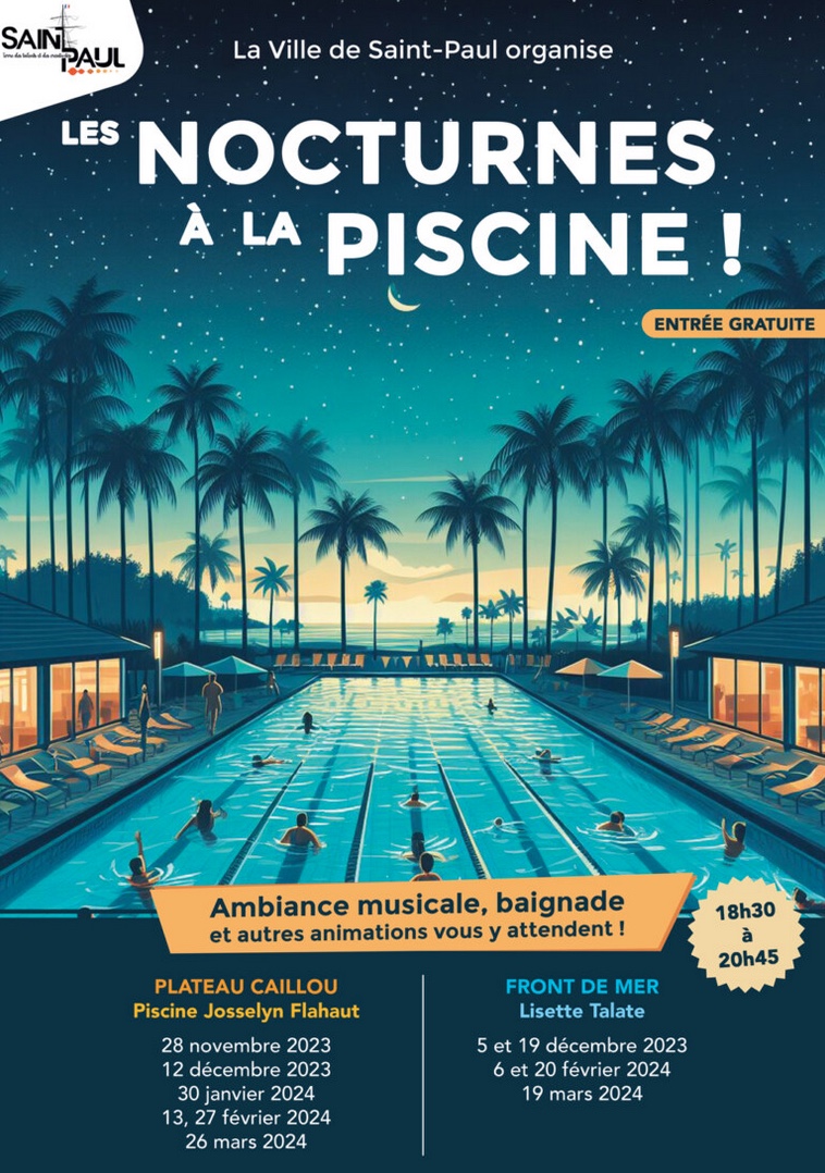 La ville de Saint-Paul met en place des nocturnes dans les piscines municipales Josselyn Flahaut à Plateau Caillou et Lisette Talate, sur le front de mer jusqu'au mois de mars 2024. Des baignades nocturnes accompagnées d'une ambiance musicale et d'animations. Nous publions le communiqué de la mairie ci-dessous.