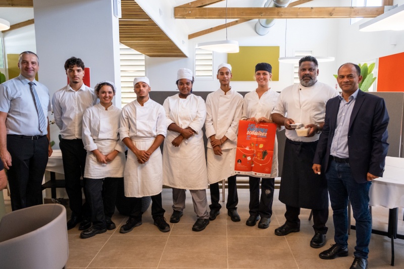 Du 27 mars au 7 avril 2023 se déroule l’événement “Cuisines Solidaires – La Relève” en partenariat avec la ville de Saint-Paul, le Secours Catholique et la Croix Rouge. Dans ce cadre le maire de Saint-Paul, Emmanuel Séraphin et les élu(e)s Nila Radakichenin et Yann Crighton se sont rendus au lycée professionnel hôtelier La Renaissance à Plateau Caillou où les élèves ont mis les petits plats dans les grands pour les associations caritatives du territoire. Cette 10ème édition, engagée contre la précarité alimentaire, a pour objectif de sensibiliser les élèves d’écoles hôtelières en leur faisant cuisiner des repas pour les bénéficiaires de l’aide alimentaire. Ce mardi 28 mars, les élus ont donc participé à un déjeuner produit par 15 étudiants du lycée hôtelier. Ils ont concocté 300 repas qui seront distribués aux plus démunis : 120 pour le Secours Catholique, 180 par le CCAS. La distribution est réalisée par les référents d’associations qui procéderont ensuite à une distribution auprès de leurs bénéficiaires. (Photo : ville de Saint-Paul)