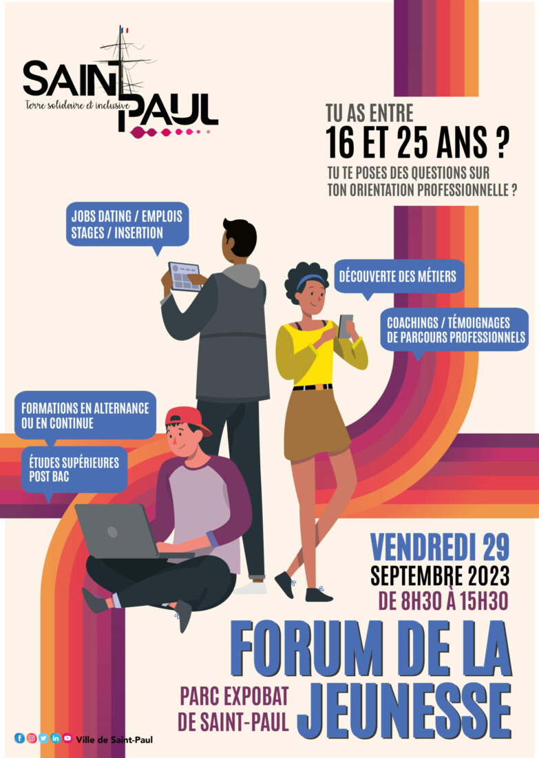 Si vous avez entre 16 et 25 ans et que vous ne savez pas encore quoi faire de votre avenir professionnelle, un forum de la jeunesse est organisé à Saint-Paul ce vendredi 29 septembre 2023 de 8h30 à 15h30 au parc Expobat.