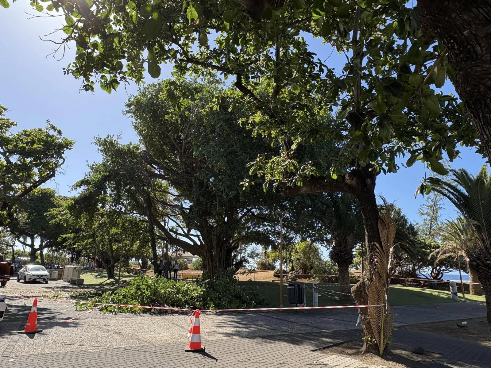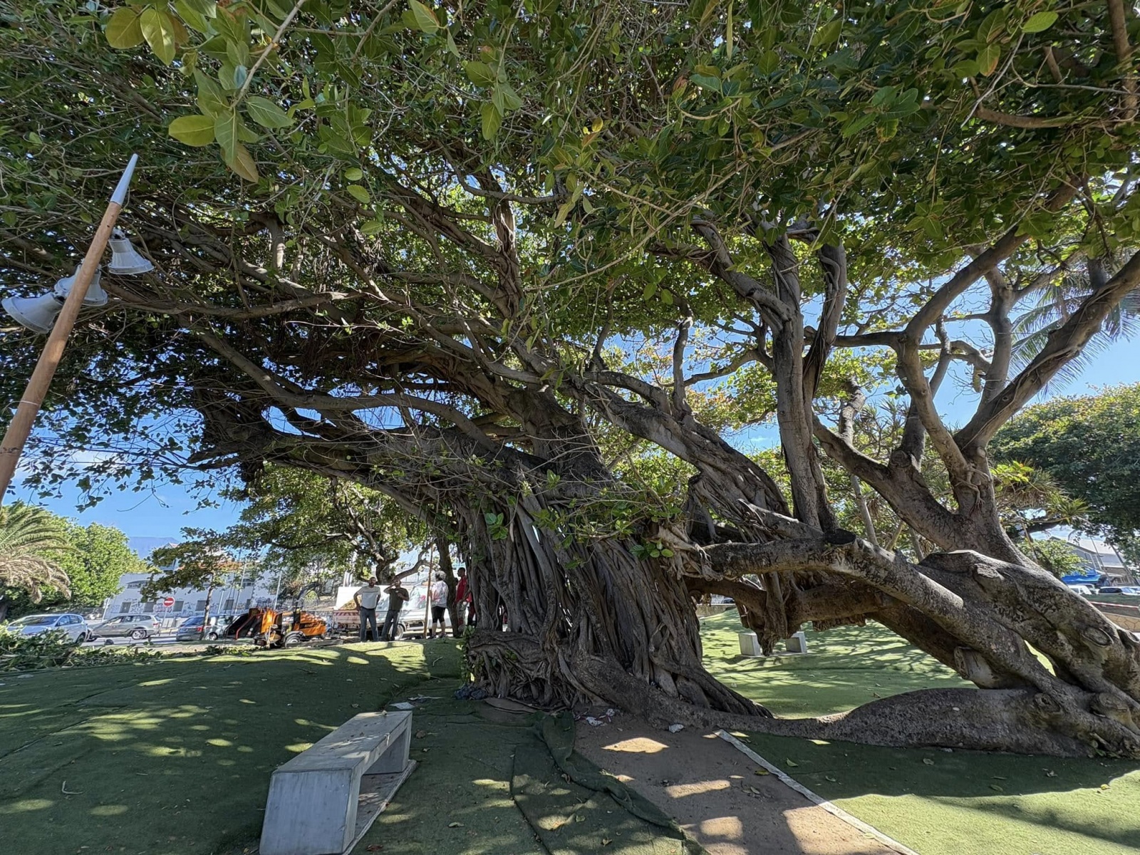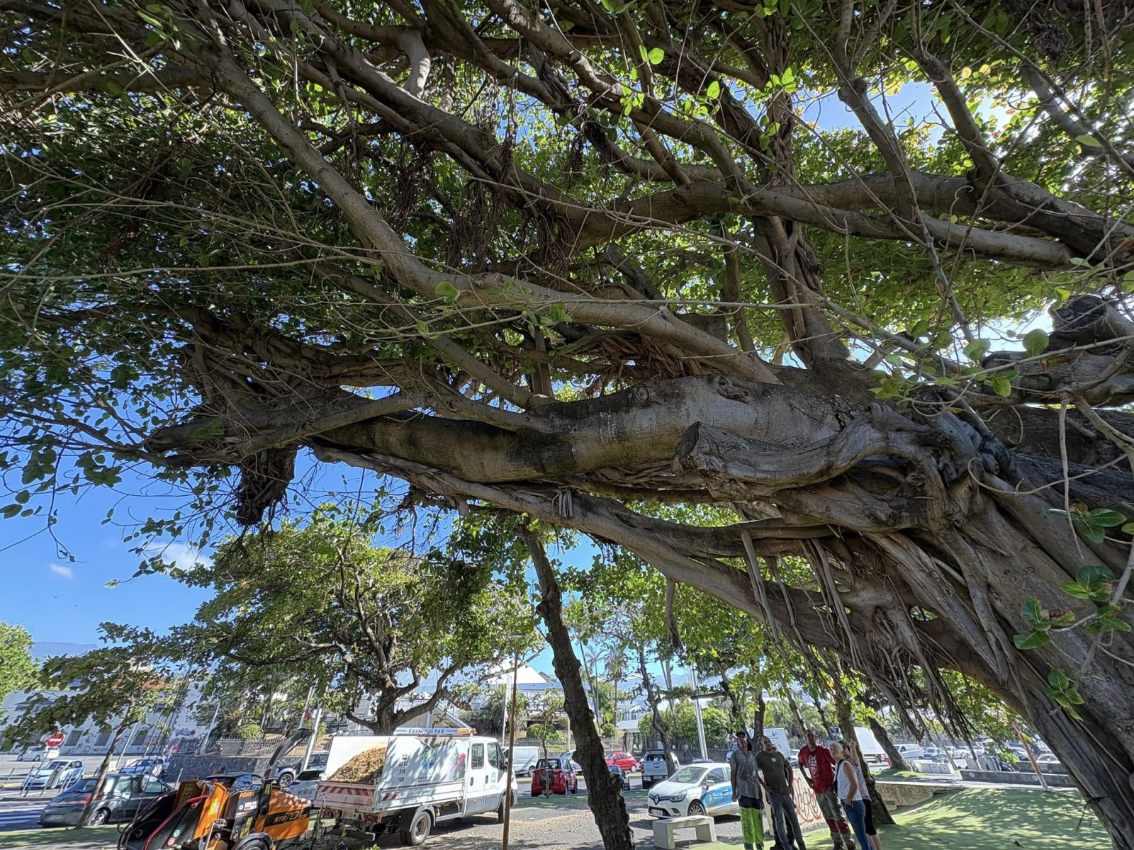 La ville de Saint-Pierre procède à une sécurisation d'une partie des jardins de la plage suite à une menace imminente de la chute d'une branche d'un des banians. Regardez.