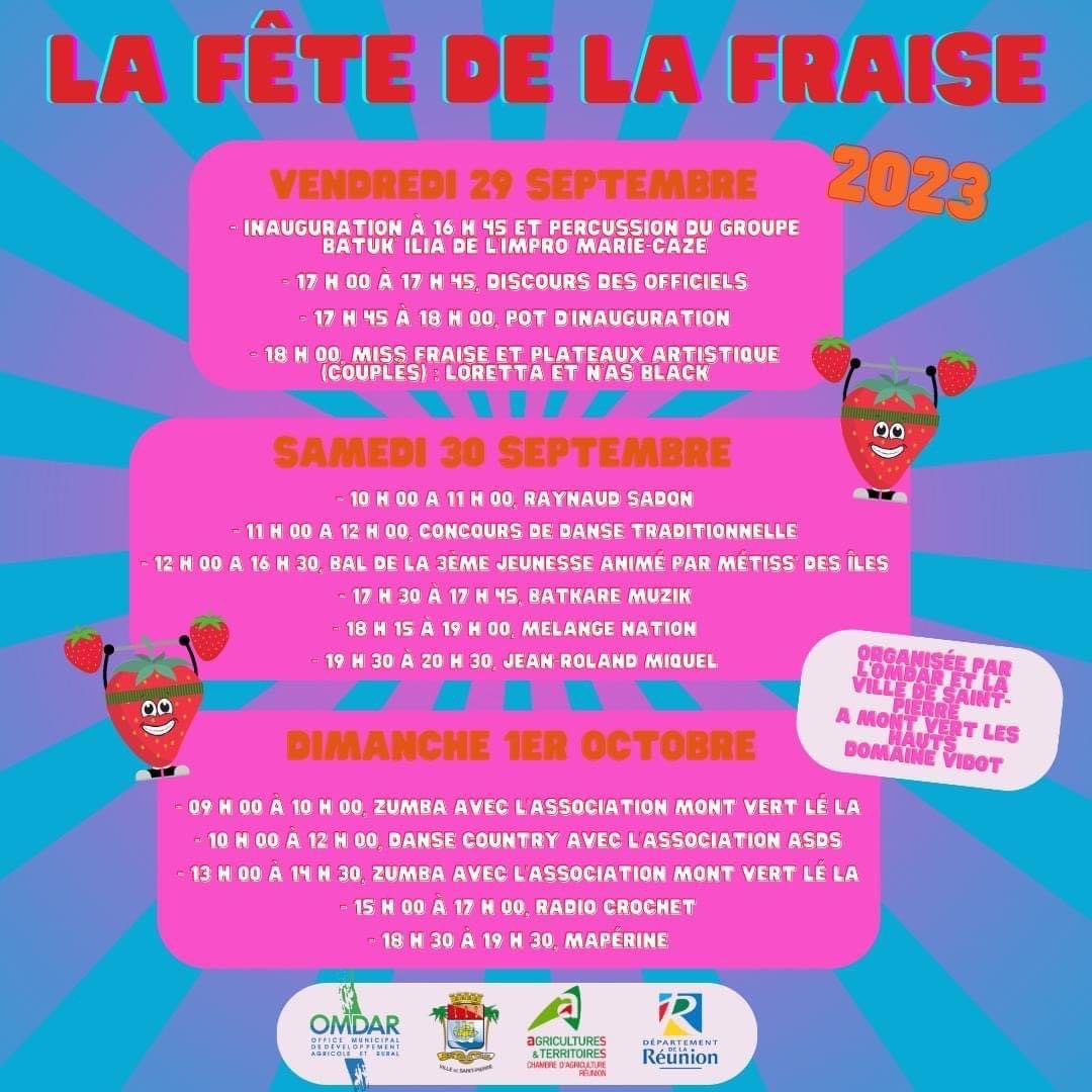 À compter de vendredi 29 septembre et jusqu'au dimanche 1er octobre 2023, la fraise est en fête au Domaine Vidot à Mont Vert les Hauts à Saint-Pierre. Un événement organisé par l'Office municipale de développement, agricole et rural (OMDAR). Nous relayons le communiqué de la ville de Saint-Pierre.