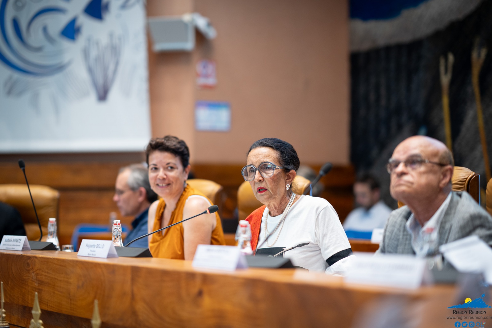 La Présidente Huguette Bello a ouvert la séquence aux côtés du Conseiller Régional Wilfrid Bertile et de la SGAR de La Réunion, Nathalie Infante.