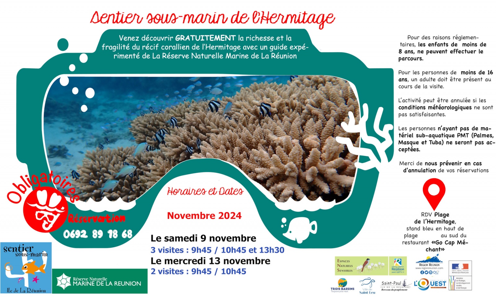 La réserve naturelle marine de La Réunion en association avec le Territoire de l'Ouest ouvre les portes de son sentier sous-marin de l'Hermitage le samedi 9 novembre 2024 à 9h45, 10h45 et 13h30. Une seconde date est prévue le mercredi 13 novembre 2024 à 9h45 et 10h45. La Réservation est obligatoire. Nous publions le post ci-dessous (Photo : TO)