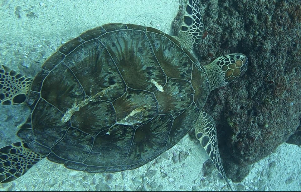 Le Centre de soin Kélonia informe que la première jeune tortue verte photographiée de l'année est blessée. Elle a été repérée le 5 janvier 2024 au niveau de Saint-Gilles, entre la Pierre au Préfet et le Canyon. Les marques parallèles et rectilignes sont caractéristiques des blessures causées par l'hélice d'un bateau. Nous publions ci-dessous leur communiqué (Photos : Kélonia)